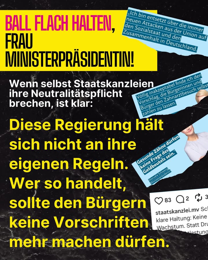 „Neutralitätspflicht? In M-V anscheinend Fehlanzeige! Die Staatskanzlei MV nutzt offizielle Kanäle und Steuergelder, um parteipolitisch gegen die Union auszuteilen, nur weil ein CDU naher Wirtschaftsrat mal laut überlegt hat, Zahnarztleistungen stärker privat abzusichern. Das ist KEIN neutraler Service für Bürgerinnen und Bürger, das ist offener Wahlkampf auf Kosten aller Steuerzahler! Wenn selbst die Staatskanzlei die Neutralität mit Füßen tritt und einseitig Position bezieht, verliert der Staat jede Glaubwürdigkeit. Staatskanzlei = Neutral oder gar nicht! Keine parteipolitischen Attacken aus Amts-Accounts! Hände weg von unserer Neutralität! Was haltet ihr davon? Ist das noch hinnehmbar?🚫 #Staatskanzlei #ParteipolitikAufStaatskosten #mecklenburgvorpommern #BürgerZuerst #Freiheit