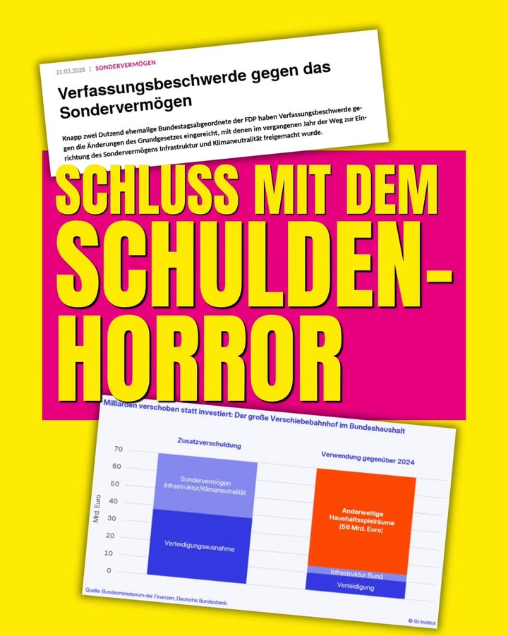 Jakob Schirmer begrüßt die #Verfassungsbeschwerde gegen das Sondervermögen: „Die massive Schuldenausweitung verschiebt Lasten einseitig in die Zukunft, zulasten junger und kommender Generationen. Das ist ein Angriff auf die finanzielle Handlungsfähigkeit von morgen.“ Für die FDP gilt: Solide #Haushaltspolitik bleibt #Generationengerechtigkeit. ⚖️📉 Unser Generalsekretär Christian Bartelt ist Miteinreicher der Verfassungsbeschwerde. 👊💪 #MecklenburgVorpommern #FDP