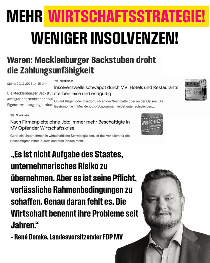 Insolvenzen sind kein Randthema mehr, sondern ein Warnsignal für Mecklenburg-Vorpommern. ⚠️ Die Insolvenz der Mecklenburger Backstuben und weiterer Betriebe zeigt: Wer in MV Arbeitsplätze sichern will, braucht endlich bessere Rahmenbedingungen – nicht noch mehr Bürokratie und Abgaben. 💬 Unsere Position: • Steigende Energie-, Personal- und Einkaufskosten bringen Unternehmen an die Grenze • Statt Entlastung gibt es immer neue Vorschriften und höhere Lasten • Mit immer neuen Schulden lässt sich kein Wachstum erzwingen Mecklenburg-Vorpommern braucht jetzt eine klare Wirtschaftsstrategie – planbare Energiepreise, weniger Bürokratie, wettbewerbsfähige Steuern. Nicht morgen, sondern heute. 👉 Was ist deine Erfahrung mit der wirtschaftlichen Lage in MV – als Unternehmer, Beschäftigter oder Auszubildender? Schreib’s in die Kommentare.
